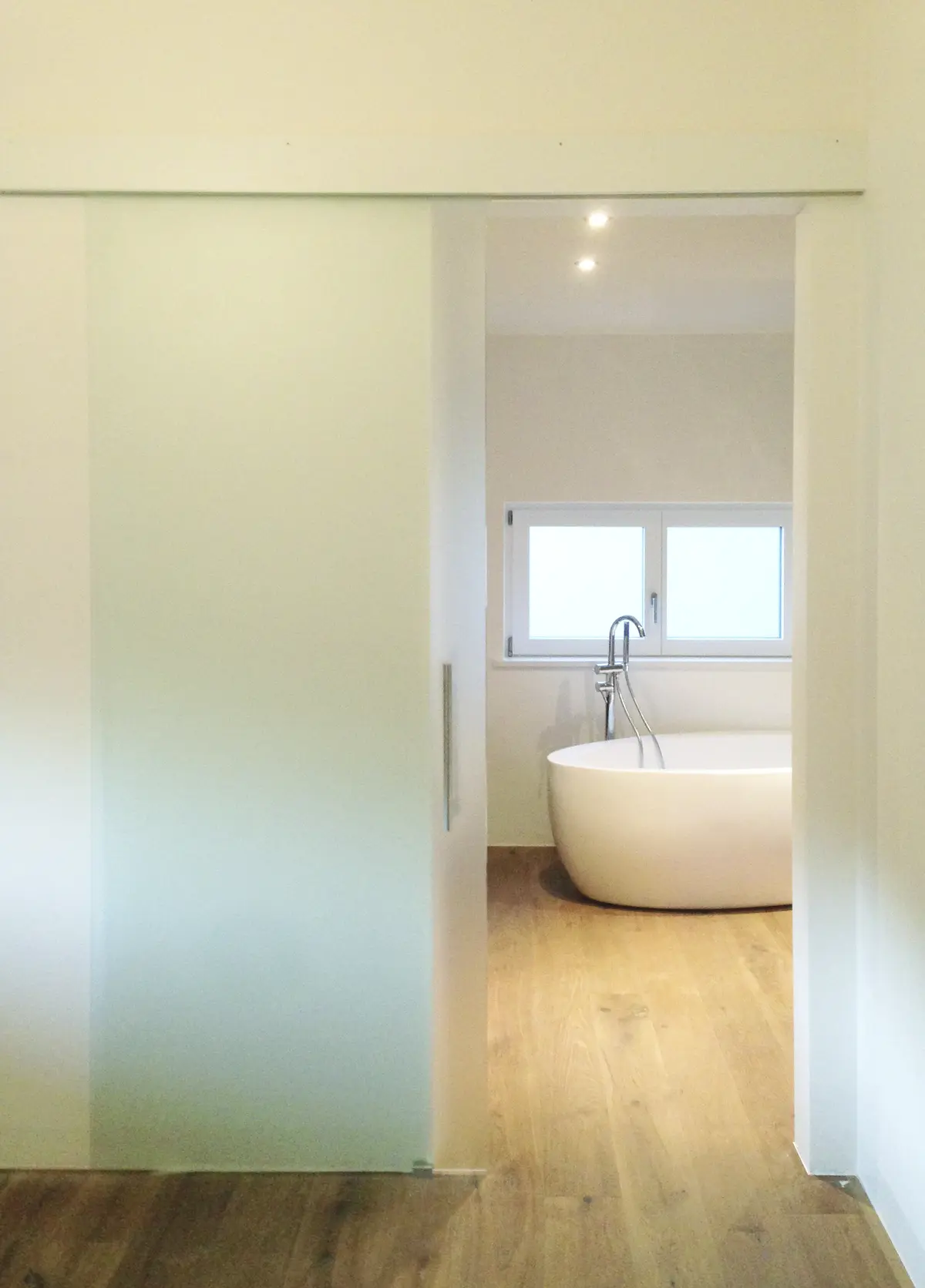 Die Schiebetüren aus unserer Tischlerei in St. Peter/Lajen verbinden platzsparende Funktion mit elegantem Design. Ob als außen laufende Variante vor der Wand oder platzsparend in der Wand integriert. Auf Wunsch statten wir Ihre neue Schiebetür mit fixem Seitenteil oder durchgehender Festverglasung aus. Hochwertige Laufbeschläge mit kugelgelagerten Rollen und Soft-Close-Dämpfern gewährleisten ruhigen, langlebigen Betrieb selbst bei großformatigen Elementen. So fügen sich Ihre neuen Schiebetüren harmonisch in jedes Interieur ein.